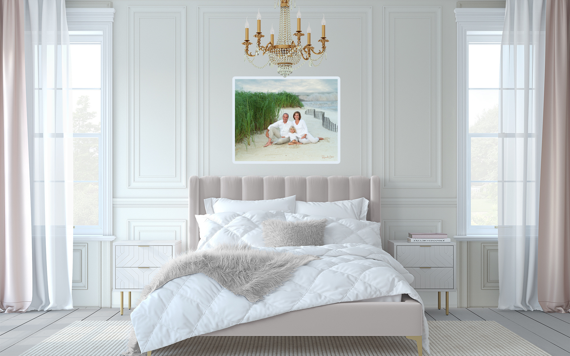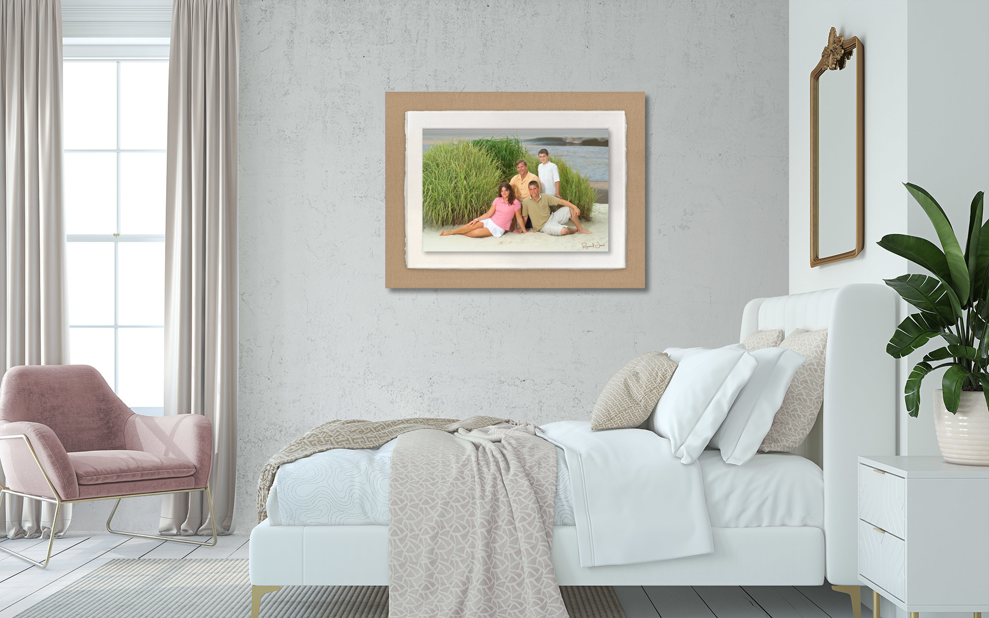 The Amalfi portrait is pure art. It's a custom made photograph that's matted with Amalfi handmade paper and printed on Fine Art Paper mounted on a fabric panel customized to compliment your home. Ready to be displayed on your wall, no frame needed.